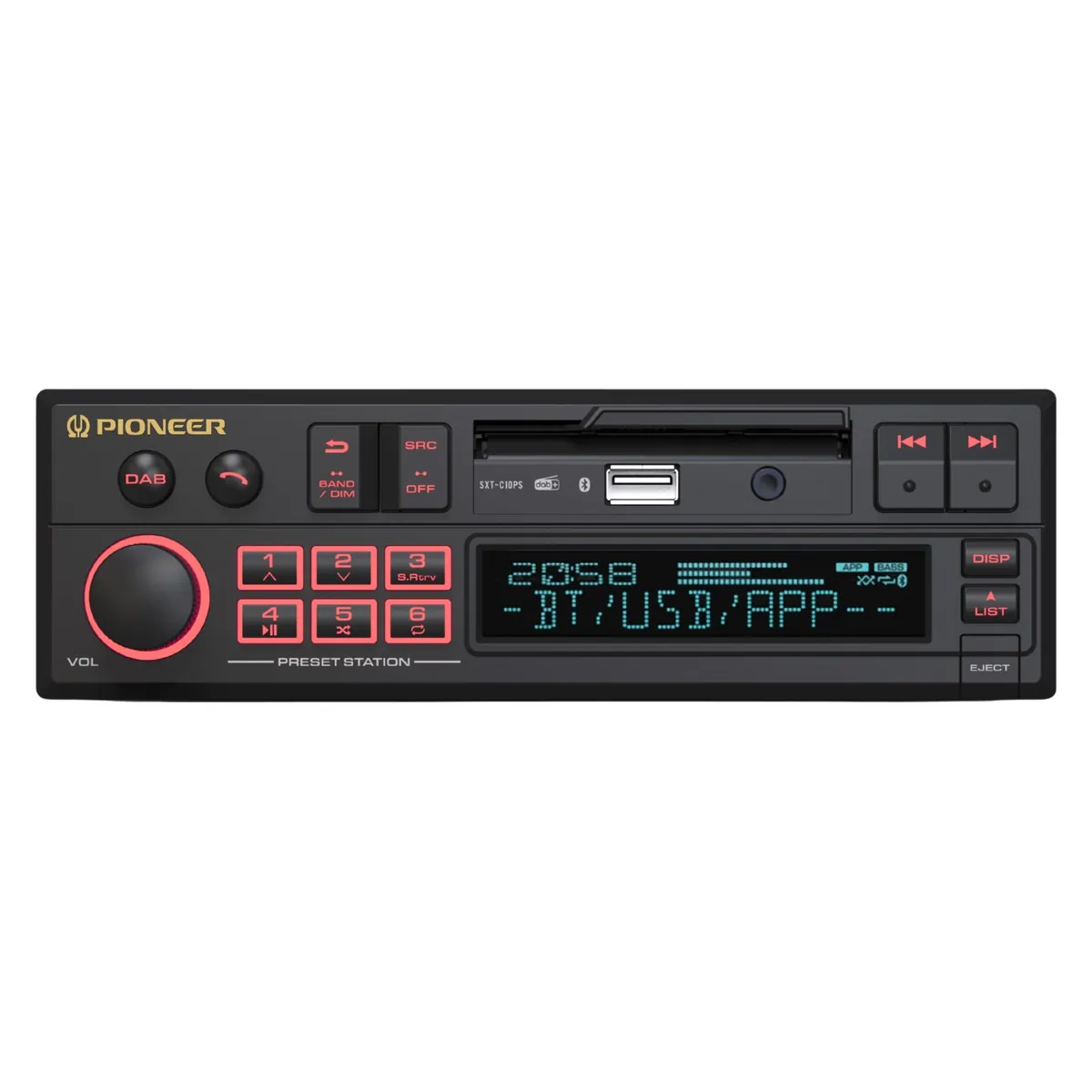 La SXT‑C10PS richiama il design delle autoradio del passato ma integra funzioni all’avanguardia per soddisfare le esigenze moderne. Il pannello frontale presenta manopole e pulsanti cromati, insieme a un display a matrice facile da leggere. L’illuminazione multicolore consente di scegliere tra varie tinte per adattarsi al cruscotto o creare un’atmosfera personalizzata.