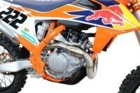Descrizione del terminale: Impianto completo COMPETITION, uso pista, RIENTRA NEI limiti di omologazione FIM, il kit è composto da collettore con espansione ULTRABOMB e terminale della nuova linea PENTACROSS. Collettore e silenziatori sono realizzati in acciaio inox 304, incremento di prestazione medio di 2cv, notevole abbattimento del peso, sviluppato grazie alla collaborazione con team di MXGP