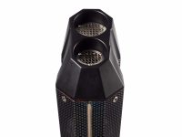Terminale SONIC POPPY della nuova generazione di prodotti GPR,silenziatore realizzato con fondelli in Ergal ricavati dal pieno mediante lavorazione CNC, scarico con uscita doppia e corpo in acciaio inox 304 carbon look lucido, realizzato con un processo di produzione green ad impatto ambientale zero