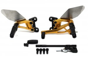 Le pedane regolabili Tipo 2.5 sono interamente realizzate in Ergal 7075 T5 lavorato su centri di lavoro CNC e sono consigliate per uso stradale. I poggiapiedi e i puntalini in alluminio sono ricoperti in gomma per migliorare sensibilmente il comfort. Le leve cambio e freno sono entrambe montate su 2 cuscinetti a sfera per ridurre al minimo l’attrito. La leva cambio permette la regolazione del puntalino di 10 mm. Le piastre regolabili permettono da 6 a 9 posizioni diverse delle pedane consentendo di trovare il miglior set-up per il proprio stile di guida. Il kit comprende le alette paratacco in acciaio inox, tutta la viteria necessaria per il montaggio, l’asta cambio della corretta lunghezza, gli snodi sferici lato cambio e lato freno e l’interruttore a pressione per la luce stop. Per le pedane VMC sono sempre disponibili tutti i ricambi.